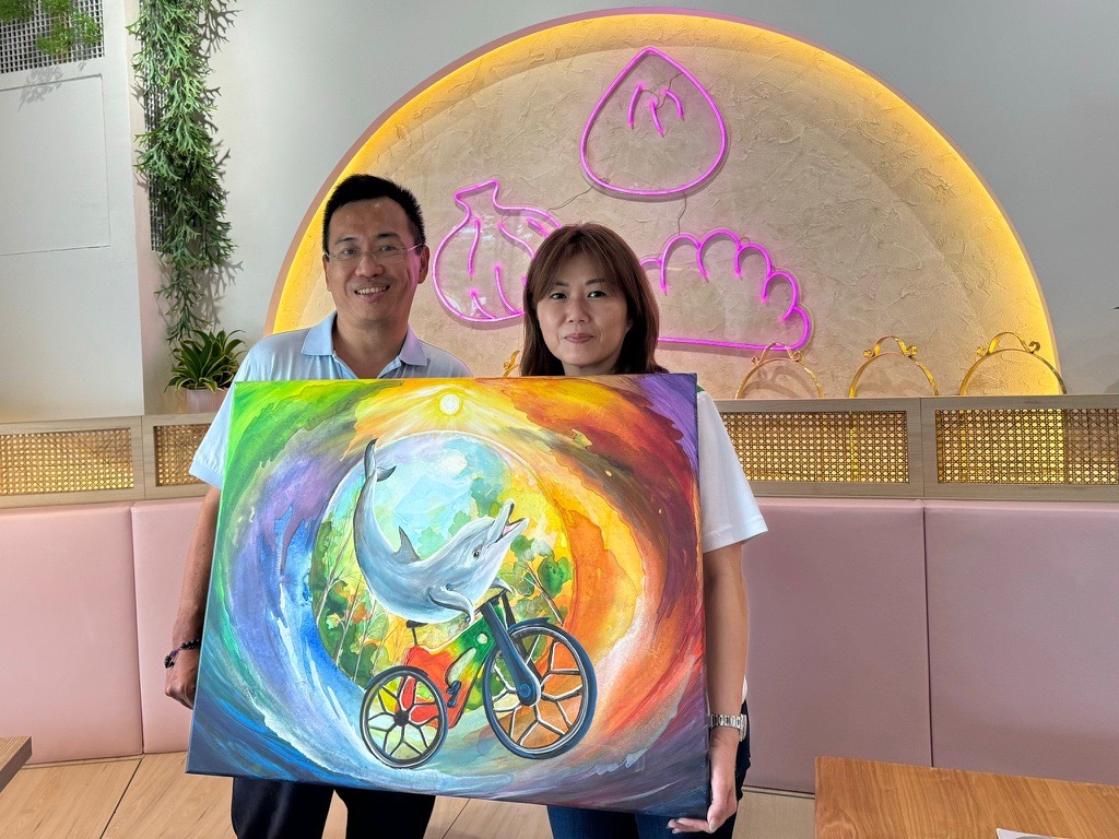After a long and fulfilling day at Crest Secondary School, the igus:bike world tour took an artistic turn for today. We were honored to welcome local artist Vincent Seet to igus Singapore. Inspired by the igus:bike and its mission of sustainability and innovation, Vincent presented us with a stunning painting that perfectly encapsulates the bike’s story and purpose.