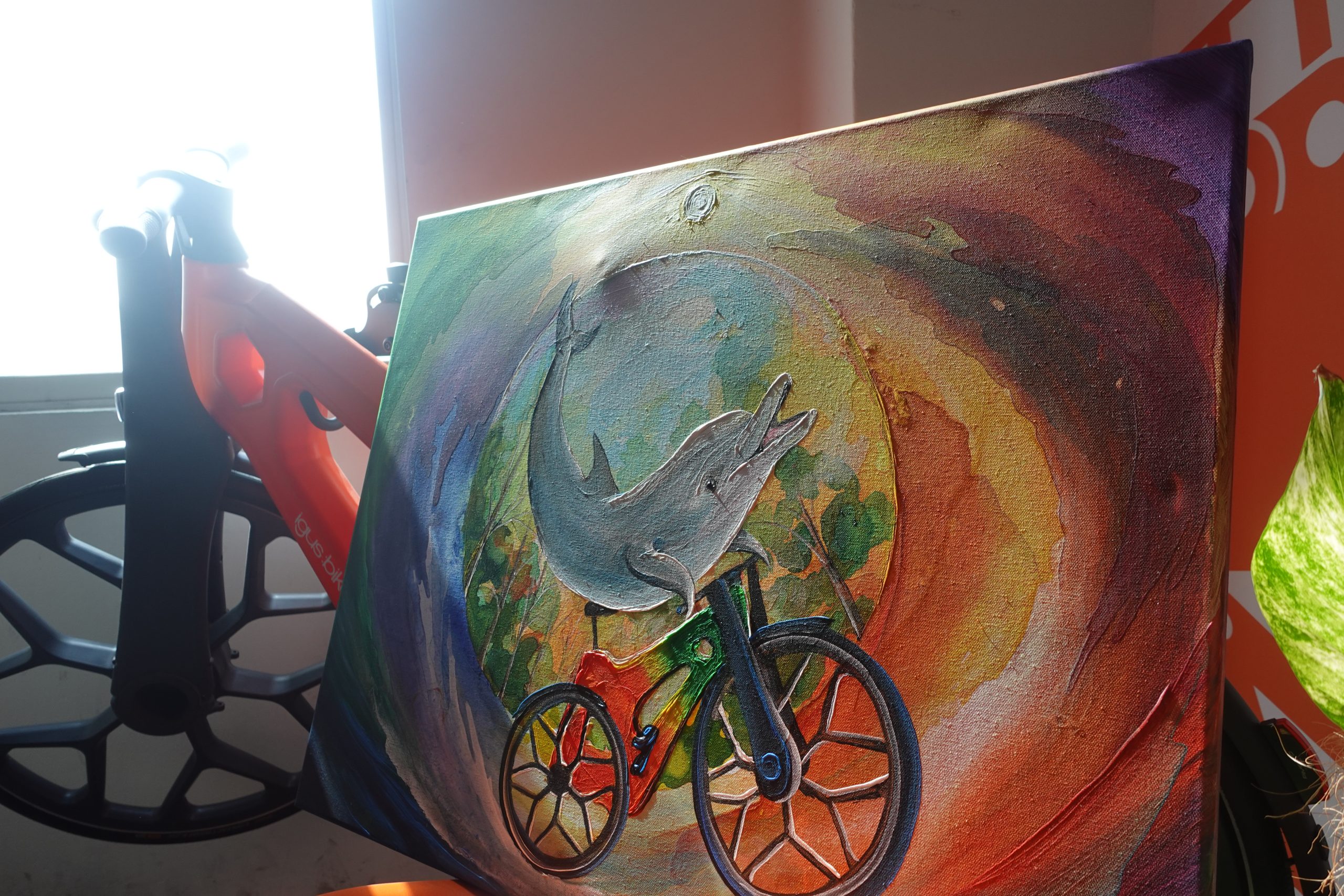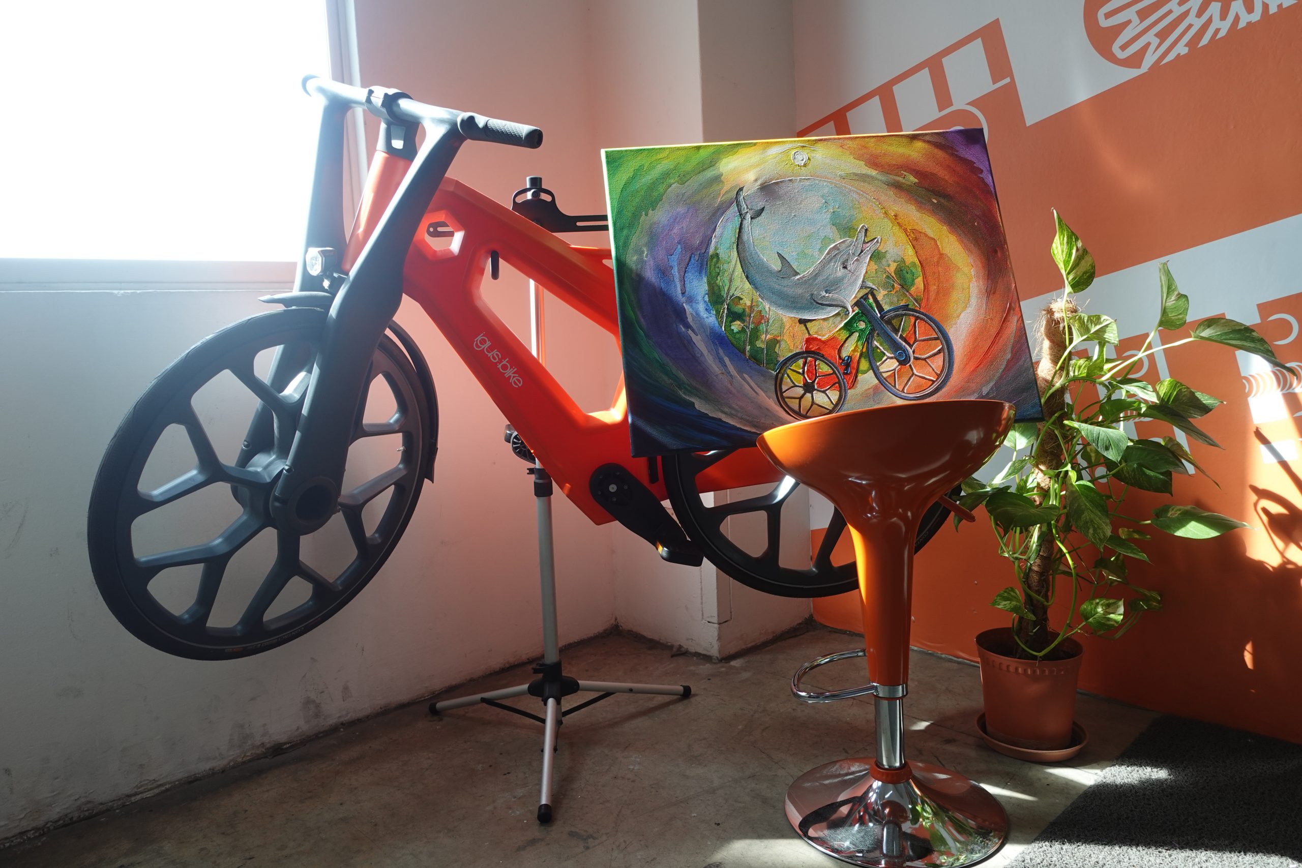 The artwork features a joyful dolphin riding the igus:bike, symbolizing the bike’s connection to the ocean and its roots in recycled plastics, such as discarded fishing nets. With vibrant hues and a backdrop of forests and ocean waves, the painting captures the igus:bike’s message—that plastic waste doesn’t have to pollute our environment but can instead be transformed into something meaningful and sustainable.