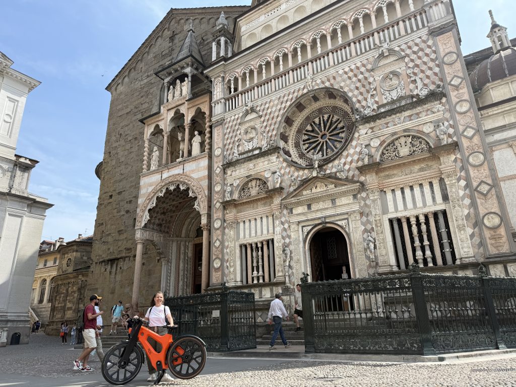 As we enter the old town, Marie – our second rider of the day – immediately understands that the blazing sun and the old cobblestones will be the real challenges of the day… But the atmosphere is relaxed and we walk and ride along the walls, soak in the views, and lose ourselves among the details of the old town. After a few kilometers through alleyways and panoramas, it’s the perfect time for a lunch in Città Alta, with local flavors and some well-deserved relaxation.