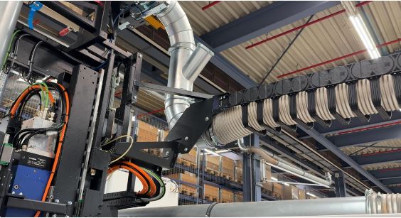 We take a look at the wood processing machines that are manufactured here. You can see very clearly that our energy chains are used here. And together with this customer, igus has also developed a specific energy chain that guides hoses.