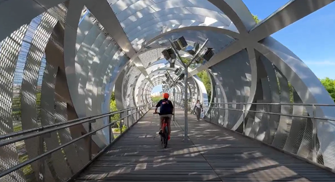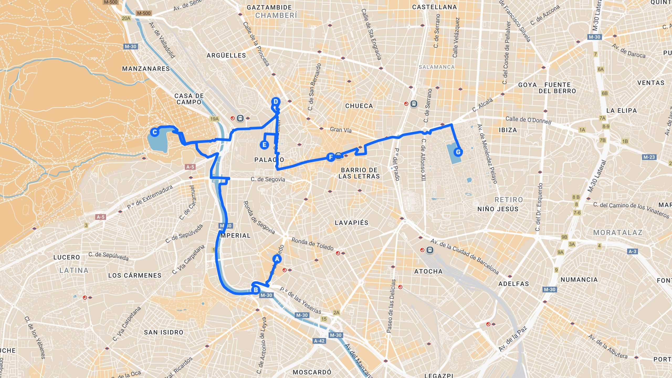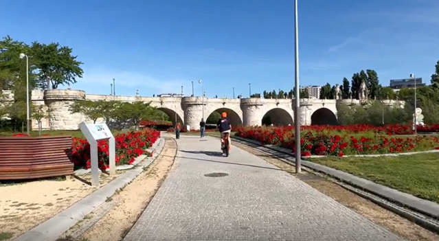 We started out from the southern part of Madrid, known as Madrid Río (Madrid River) because it runs alongside the well-known Manzanares River. What makes this green stretch of the city special is its many trees and plants, picturesque bridges, and plenty of playgrounds — including one with EIGHT huge slides. It’s a real paradise for kids!