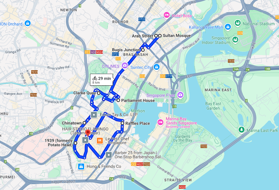 Stage 8 of the igus:bike world tour featured a ride through Singapore’s most iconic cultural landmarks. The journey began at Arab Street and Sultan Mosque, followed by the colorful murals of Haji Lane and the vibrant Bugis Junction, where modern malls meet heritage charm. Passing through the Civic District, highlights included landmarks such as Parliament House and the skyscrapers of Raffles Place, followed by the peaceful riverside views at Clarke Quay. The ride then moved through Chinatown, with a brief stop at the historic Potato Head on Keong Saik Road, before ending at the majestic Buddha Tooth Relic Temple. This route showcased Singapore’s seamless blend of cultural heritage and modern progress.