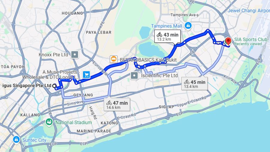 As the first stage of the igus:bike tour, we ride to the SIA Sports Club to support the football match between the igus team and a surprise team. We start the ride from igus Singapore which is in central part of Singapore to SIA Sports Club, located in the eastern part of Singapore, is situated in Upper Changi within the Tampines planning area.