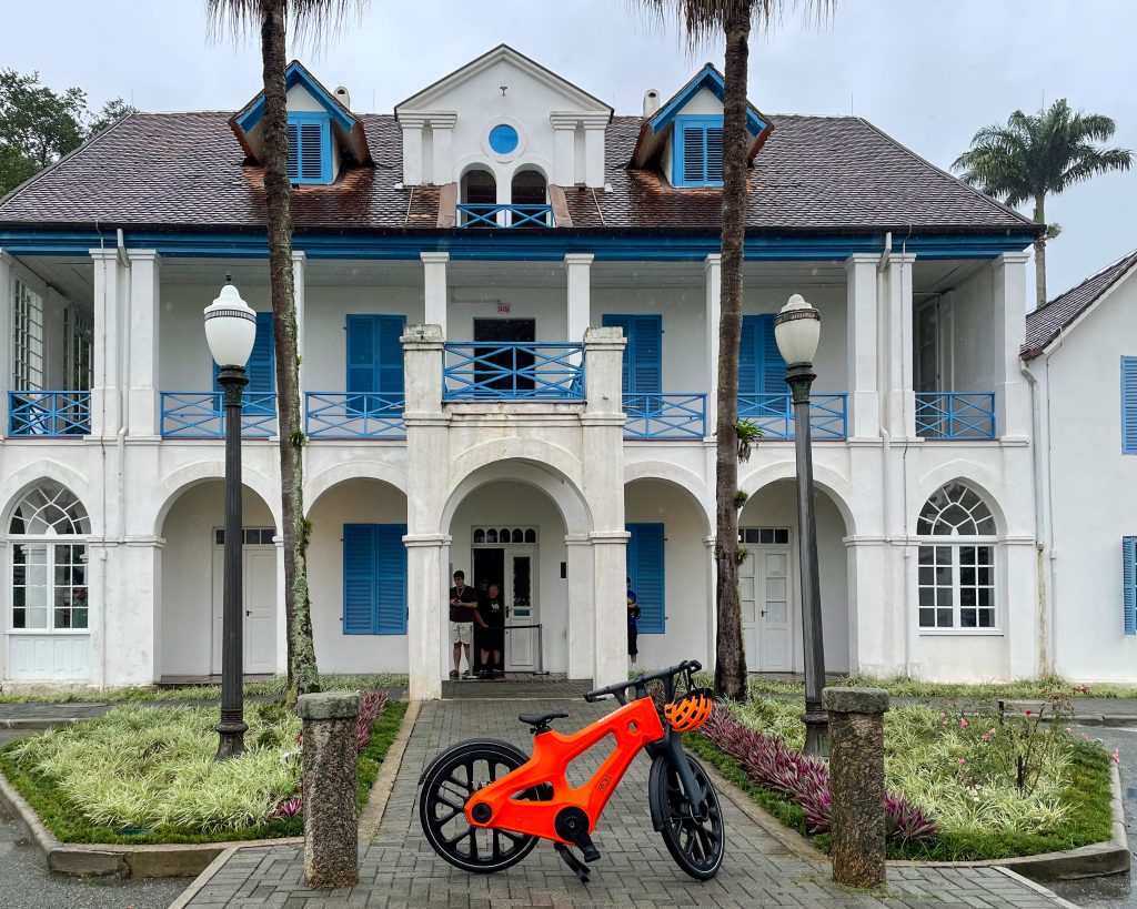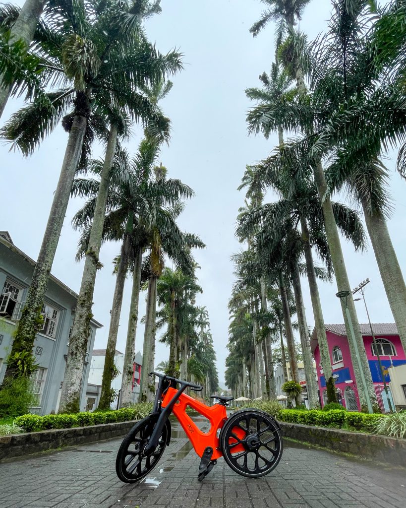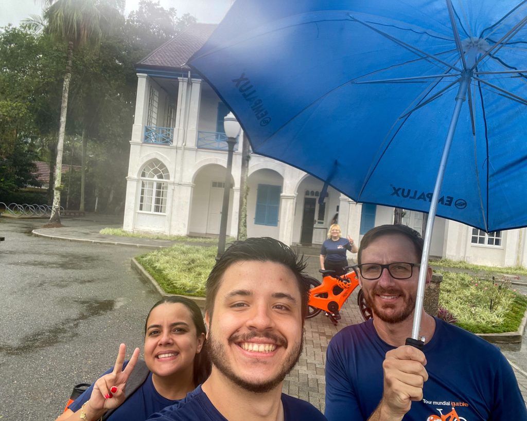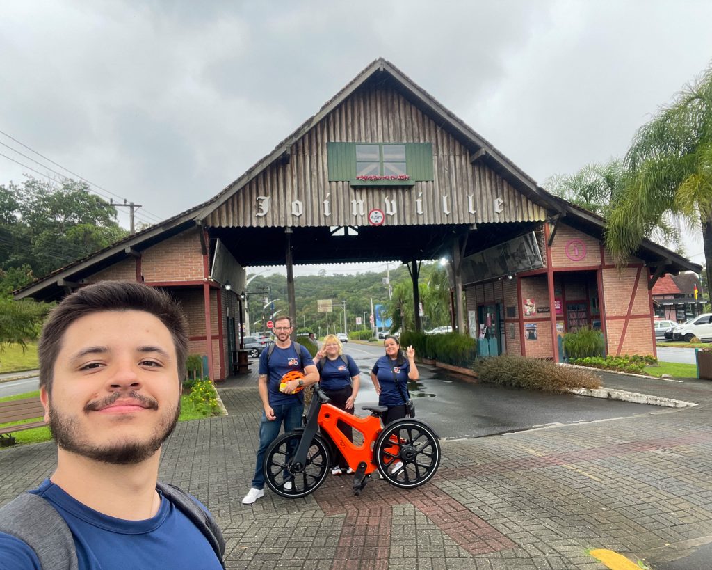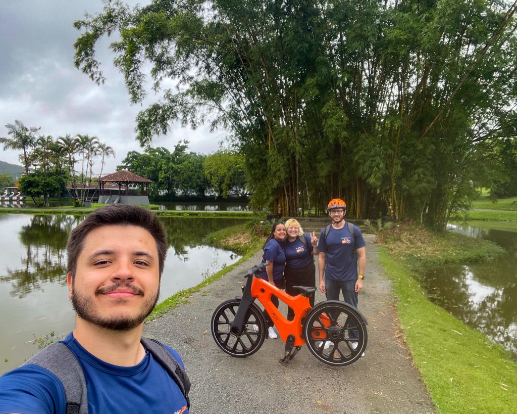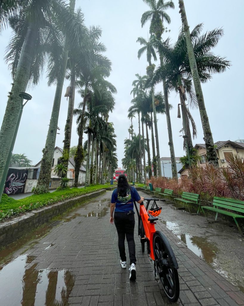 Even under the rain, the team decided to continue exploring the city by bike. The route passed by some of Joinville’s most iconic places, including the National Museum of Immigration and Colonization, located at the beginning of the famous Rua das Palmeiras.