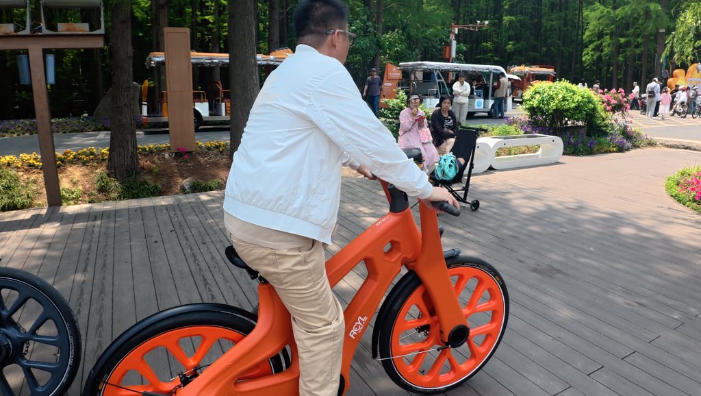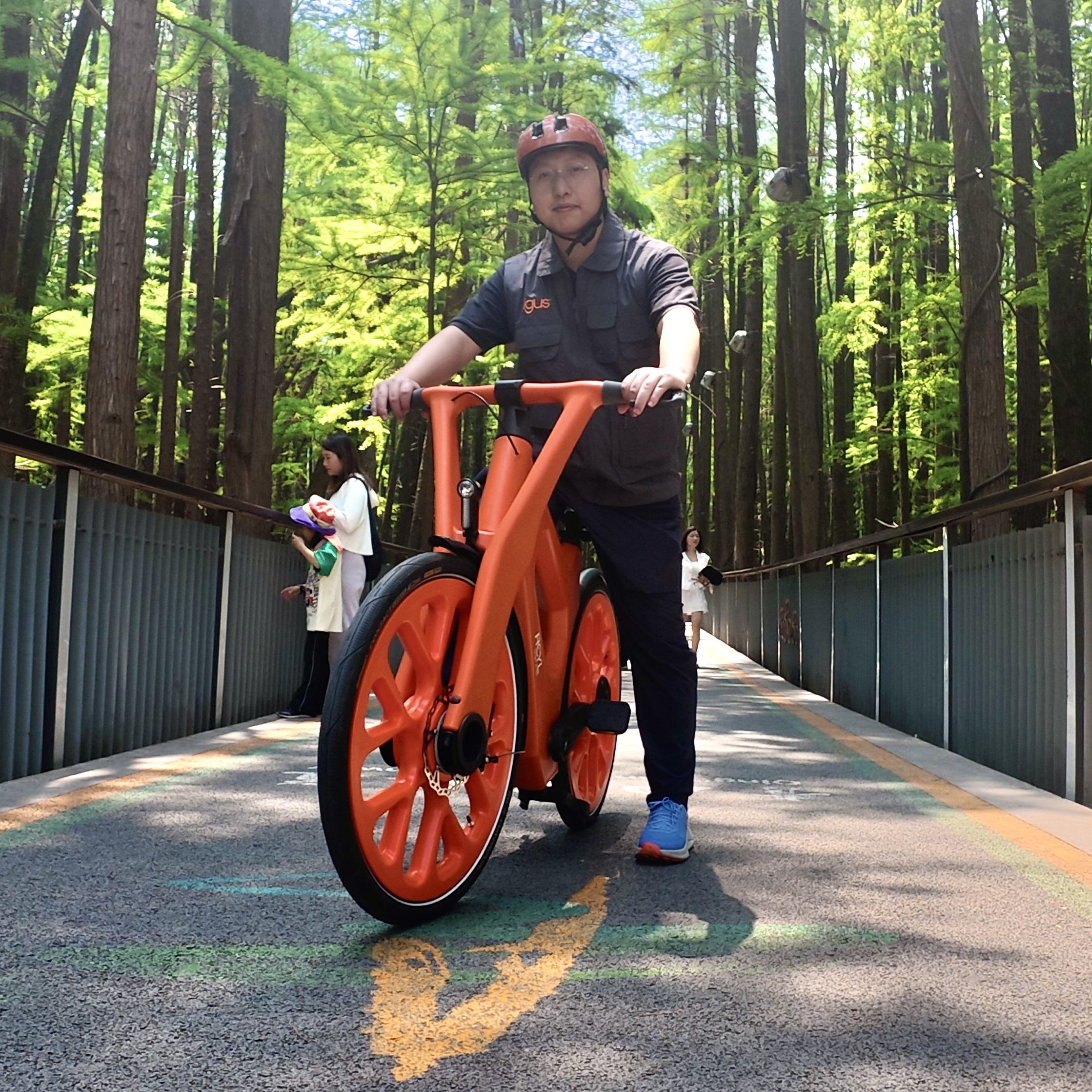 The waterlogged forest in Qingshan Lake is often referred to by netizens as Hangzhou’s “Green Wonderland.” Spanning an area of one million square meters, it features a mixed forest of pond cypress and bald cypress growing in water, with the surface covered in floating duckweed, creating a vast expanse of green. The tranquility and serenity here make it feel as though time has come to a standstill. A splash of orange from the Igus:bike, set against the lush matcha green backdrop, has captured a lot of attention, even earning an invitation to participate in upcoming local cycling promotional events.