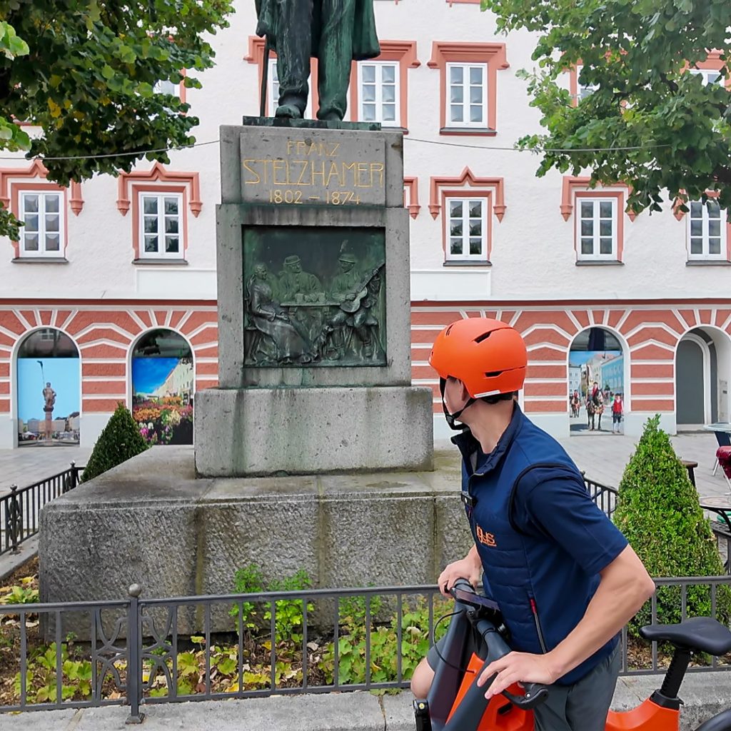 Continuing through the town center, we pause at the Franz Stelzhamer Monument, dedicated to the famous poet and lyricist of Upper Austria’s state anthem. His work in regional dialect helped shape the cultural identity of the area, and his bronze likeness now watches over the town’s daily rhythm.