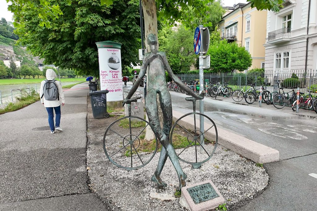 Crossing the Salzach, we reach the Marko-Feingold-Steg — a pedestrian bridge named after Austria’s last Holocaust survivor. It’s a place of remembrance and resilience. At its end stands Lotte Ranft’s sculpture of a cyclist, blending the city’s bike-friendly spirit with deeper symbolism: motion as freedom.