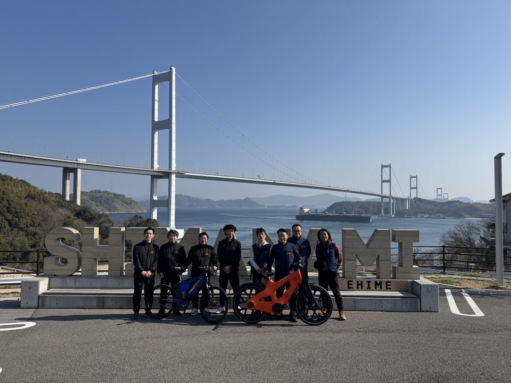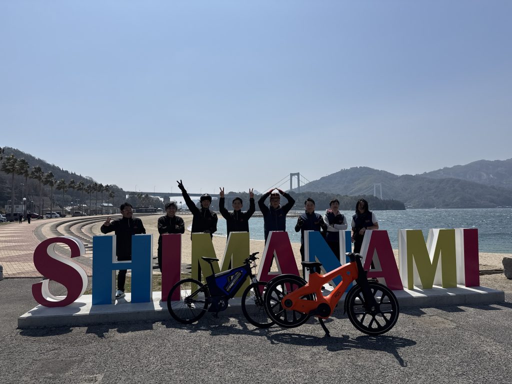 We have gathered at the SHIMANAMI Monument, the starting point of the ride. Today’s special ride is a 15km course with Toyota Boshoku’s hydrogen bicycle.