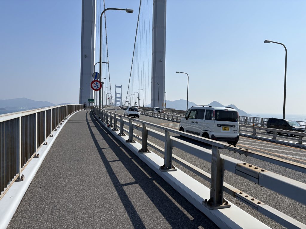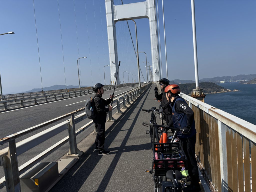 There were strong winds on this day. First, a commemorative photo was taken at the SHIMANAMI monument. This is a popular photo spot at the starting point. Cyclists can cross the bridge seen behind.