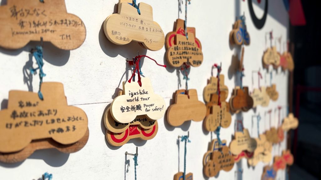 We wrote safety messages for the igus bikes on wooden boards called Ema (絵馬, lit. ’picture-horse’), on which we wrote our requests, and received the blessing of the shrine.