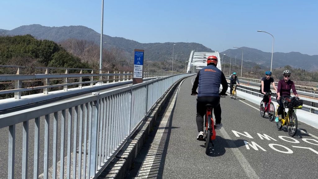 This time it was a trip around Omishima Island. Goto-san struggled with the ramp up to the bridge, but the spectacular view from the bridge blew his difficulties away. The descending slope was also very long and the riders experienced an exhilarating feeling that lasted forever.