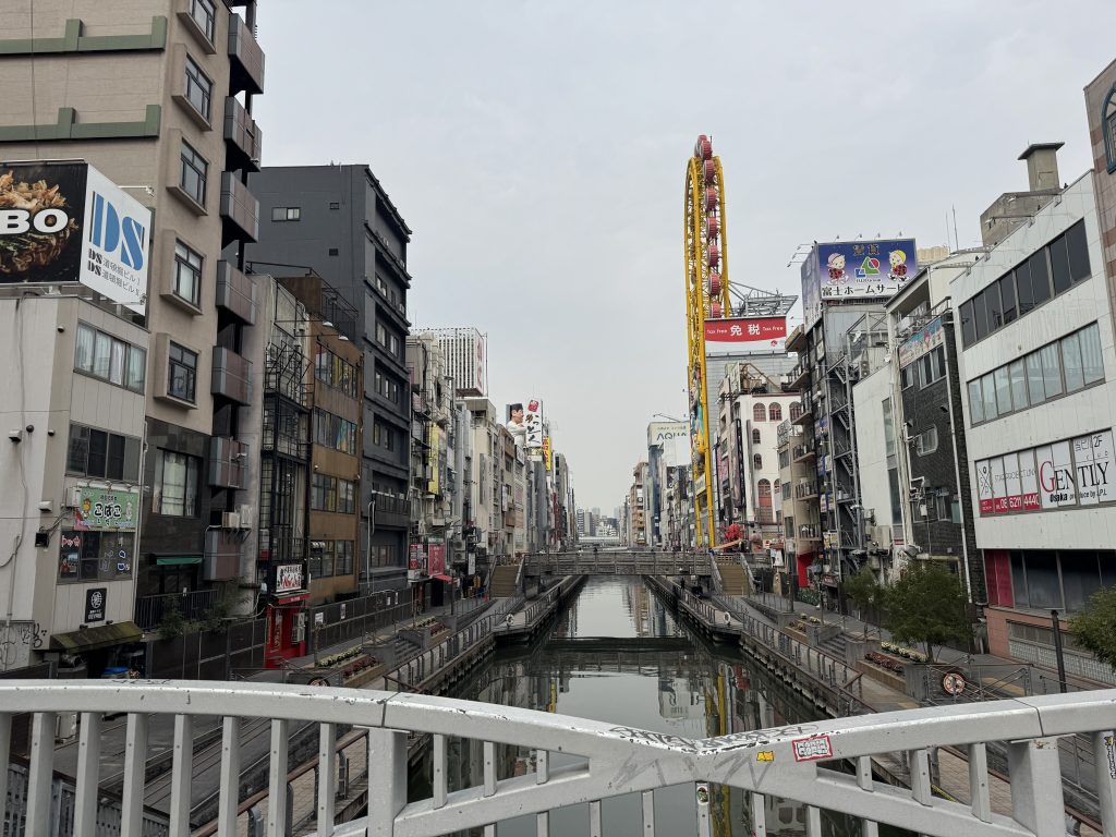 The bike headed towards Ebisu Bridge in Dotonbori, passing through Midosuji, Osaka’s central district. At first it is an office and government district lined with traditional buildings, but when you reach Ebisu Bridge, the scene suddenly changes.