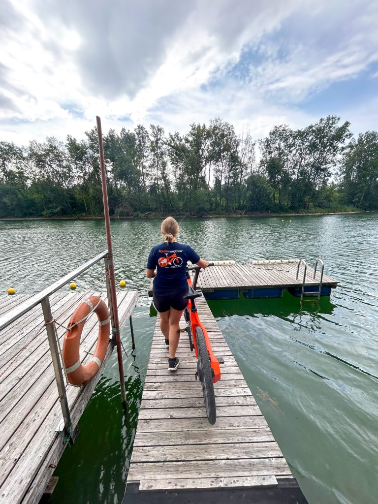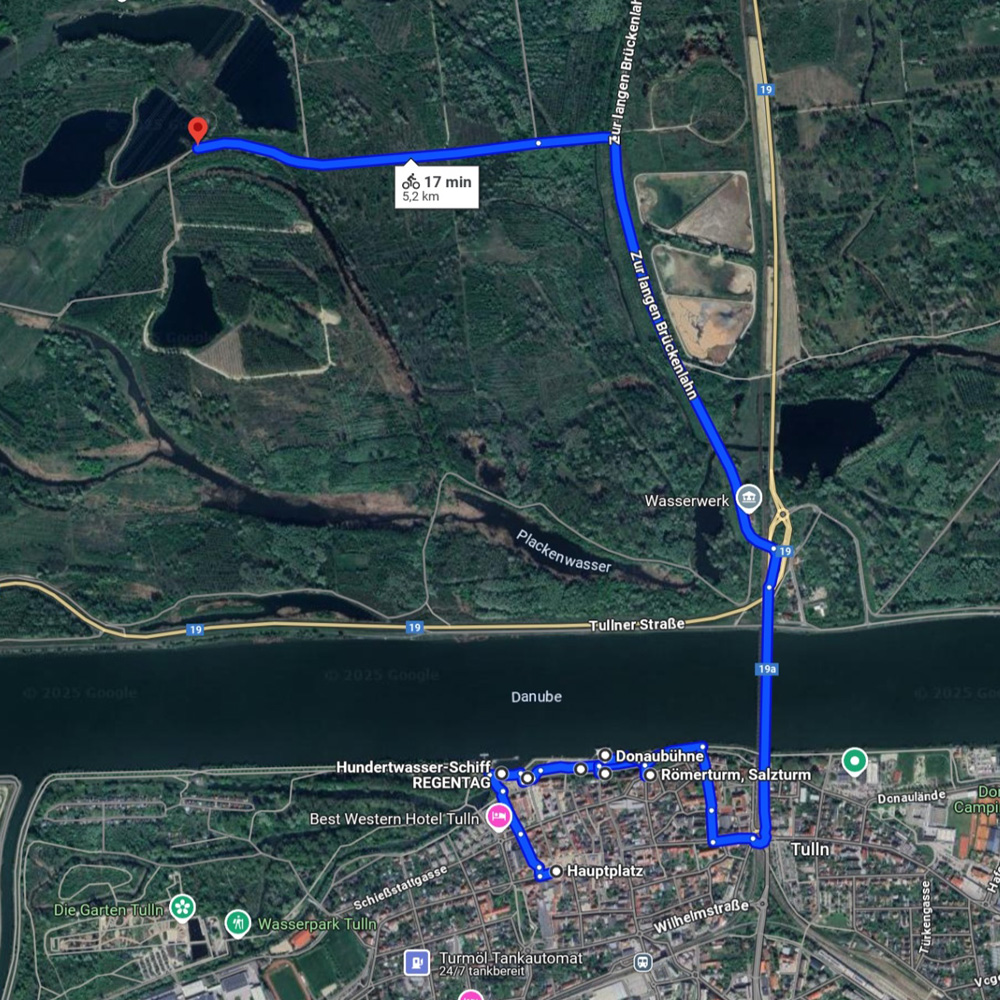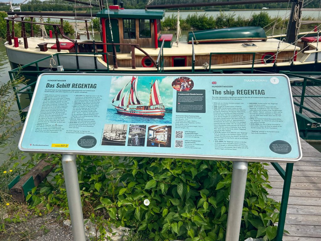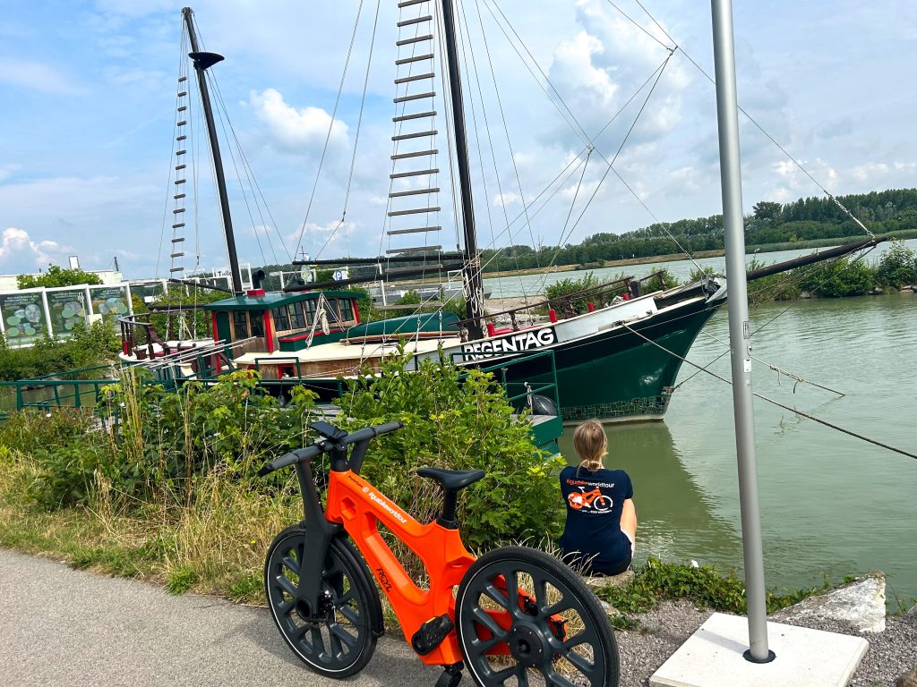 Our journey begins at Tulln’s bustling Hauptplatz, surrounded by charming historic buildings and lively cafés. Just a short ride away is the Hundertwasserschiff, an extraordinary floating house designed by the renowned artist Friedensreich Hundertwasser, blending art and architecture in a truly unique way.