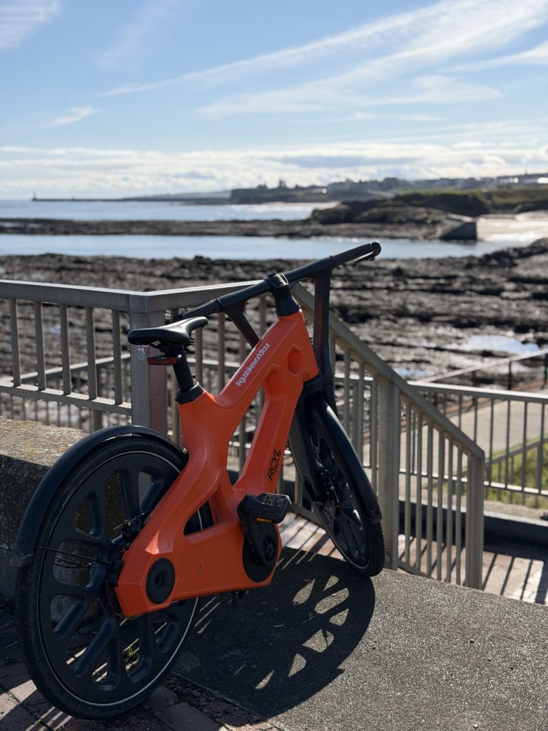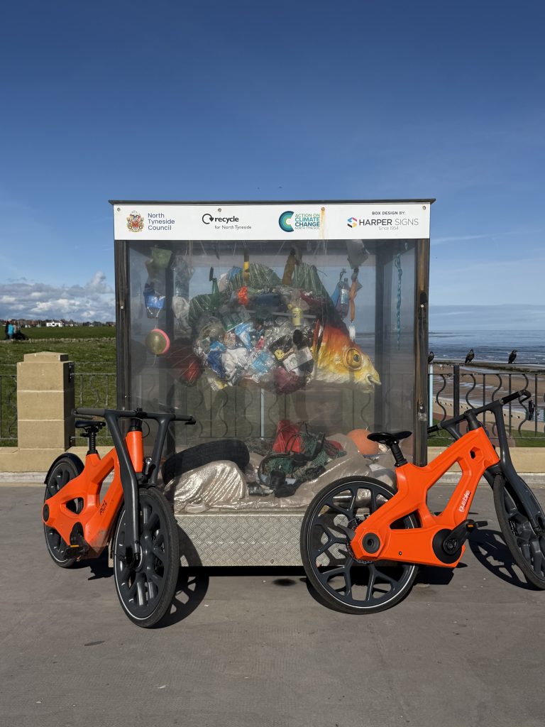 One of the highlights at Whitley Bay was admiring the giant fish sculpture situated right on the coast. This incredibly powerful six-foot sculpture, is made entirely of litter collected along the coast line. This installation is a stark reminder of the huge environmental impact single use plastic has on the wildlife and standing alongside it with a bike made up of plastic waste was a poignant moment on our UK tour.