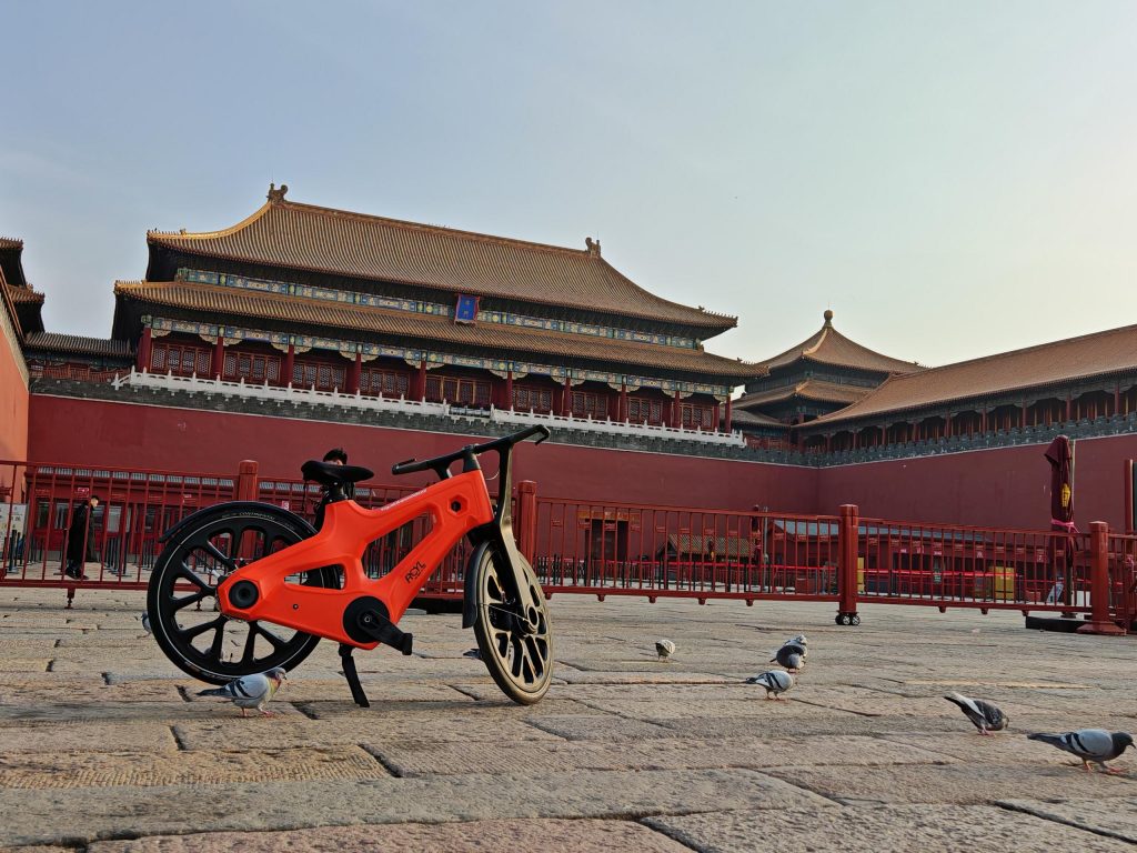As the sun climbed higher, we continue our ride along the perimeter of the Forbidden City — from West Prosperity Gate (Xihua men), passing by the Meridian Gate (Wu men), and on to East Prosperity Gate (Donghua men). All around us are red walls and charcoal-grey tiled roofs. Sunlight dances on the golden glazed tiles. Brick by brick, tile by tile — these walls have witnessed two dynasties, three reigns, and six centuries of imperial history. Once the imperial palace, the Forbidden City now serves as a museum — and stands as a true masterpiece in architectural history. The orange igus:bike contrasts beautifully with its iconic red walls.