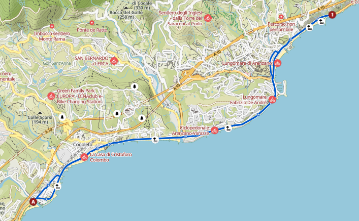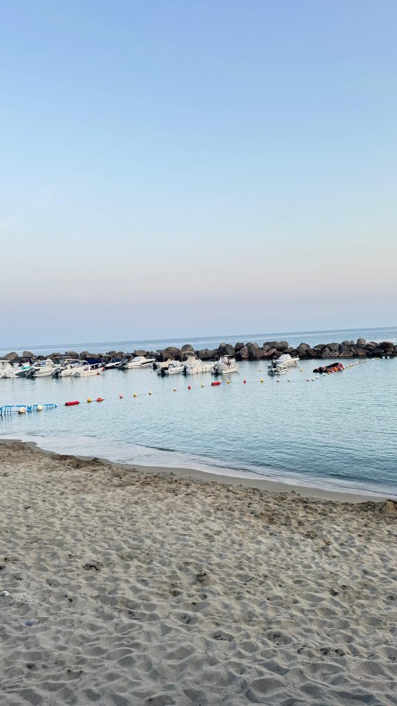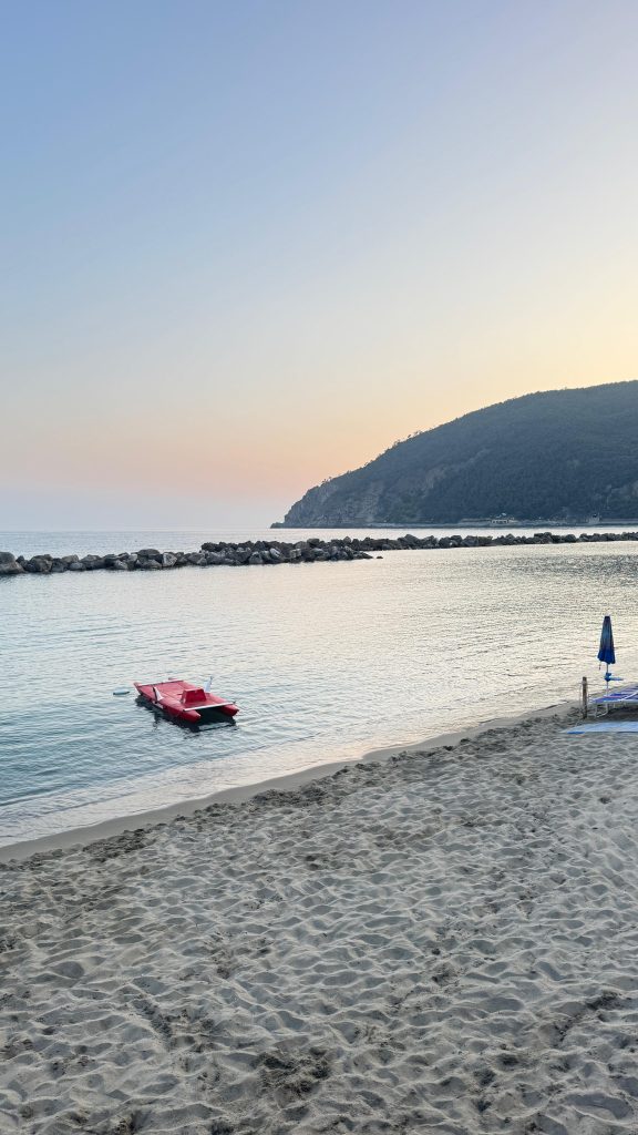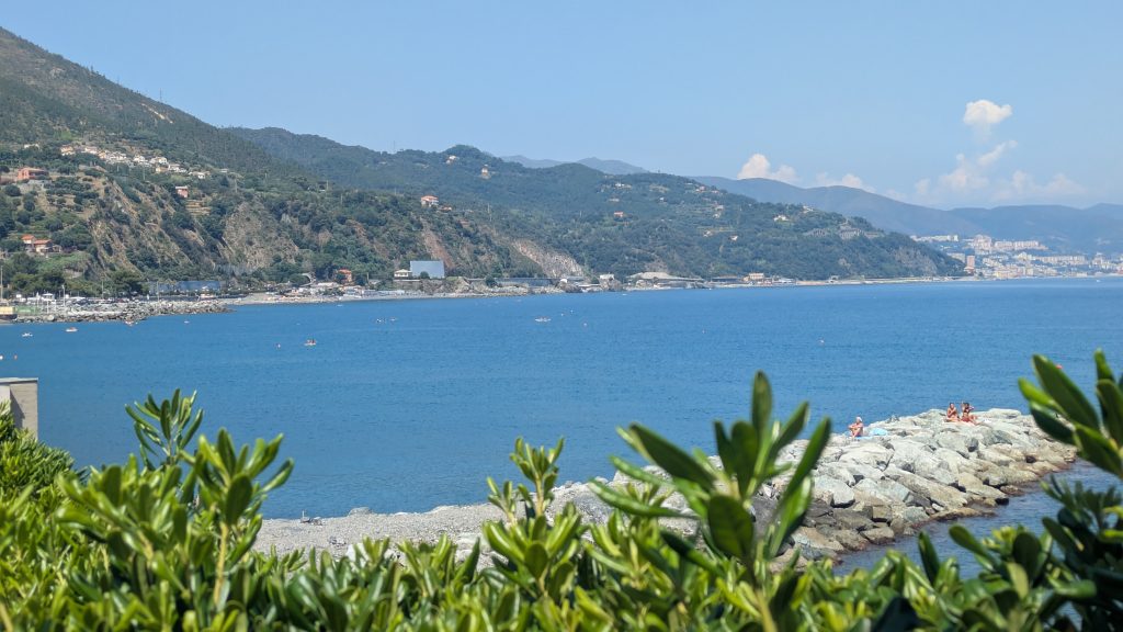 The riding bike path from Cogoleto to Arenzano runs right alongside the sea – flat, relaxing and full of sudden glimpses between rocks and blue. Every now and then we stop for a photo, or simply to look around and soak it all in. Riding here feels like gliding through a moving postcard: boats resting in the small and lovely harbor, the sound of the waves always in the background and beaches packed with colourful umbrellas and people enjoying the spectacular Ligurian sea.